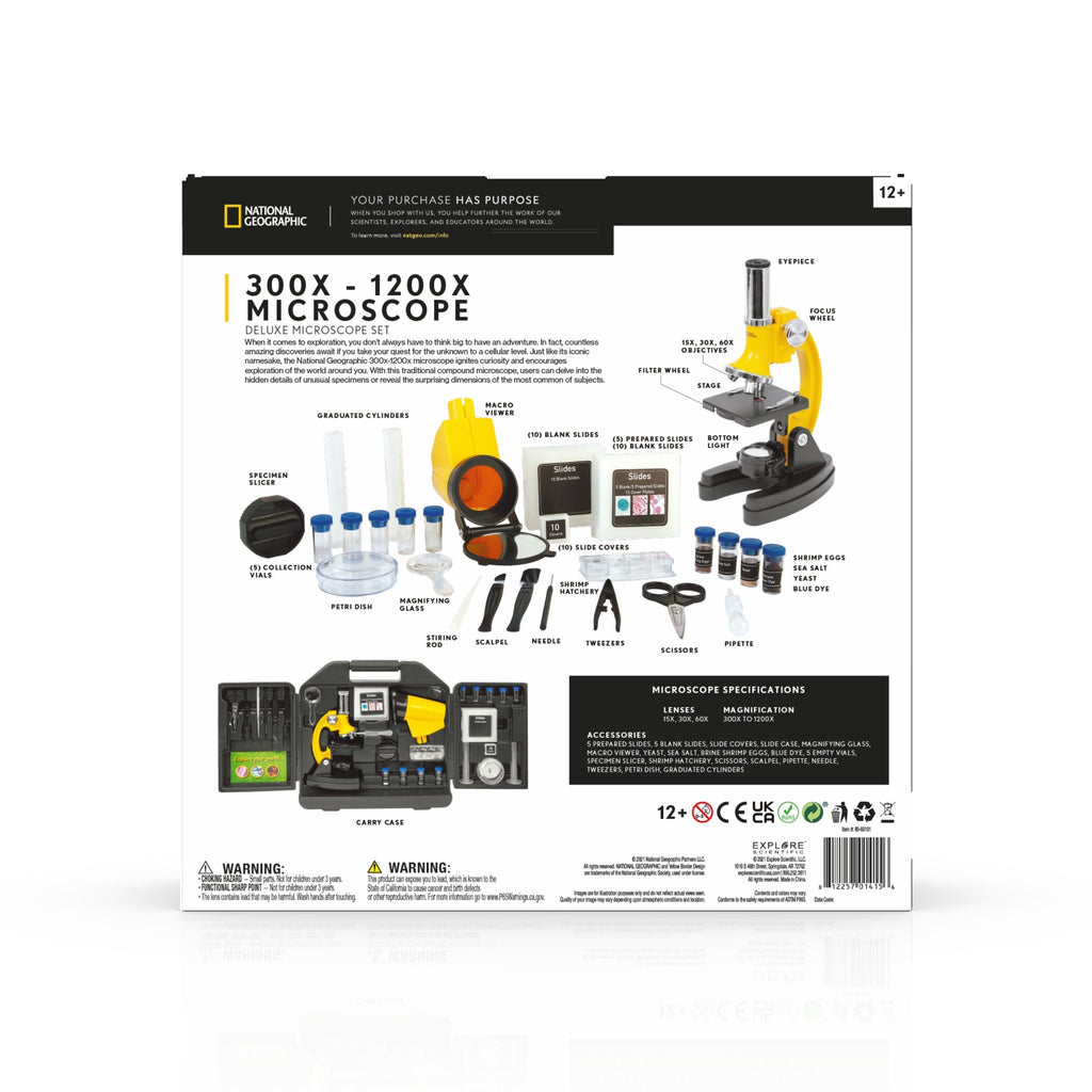 This microscope set brings scientific discovery to your fingertips with a versatile range of magnification, dual illumination, and unique viewing options. Whether you're studying a plant cell or observing tiny aquatic life, the National Geographic 300x-1200x Microscope offers powerful tools to examine specimens in detail. A projection eyepiece enables easy sharing or tracing, while a full accessory kit and durable hard case make it perfect for science at home or on the go.