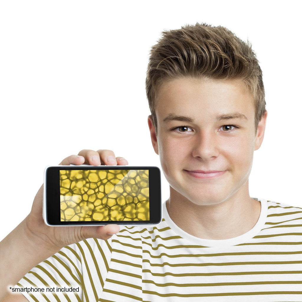 Secure your phone with the included adapter to snap photos and share your discoveries. A complete set of tools — including slides, vials, pipette, shrimp hatchery, yeast, tweezers, and a handheld magnifier — makes hands-on science easy and fun.