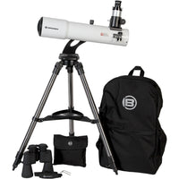 For added versatility, the kit includes 7x50 Porro prism binoculars featuring multi-coated glass that delivers bright, sharp images—perfect for both stargazing and daytime nature observation. All components pack neatly into a durable backpack designed to hold the telescope, binoculars, and alt-azimuth head, with an external tripod mount for easy transport.
