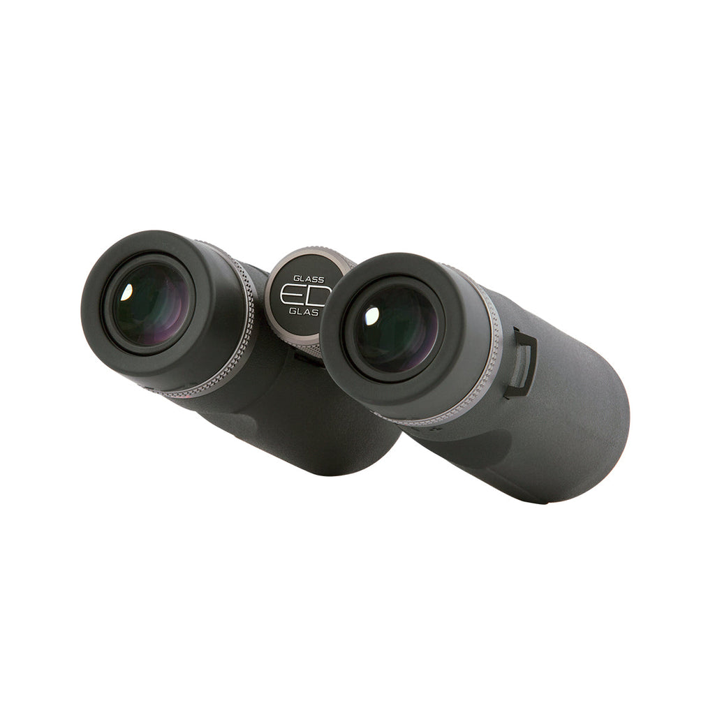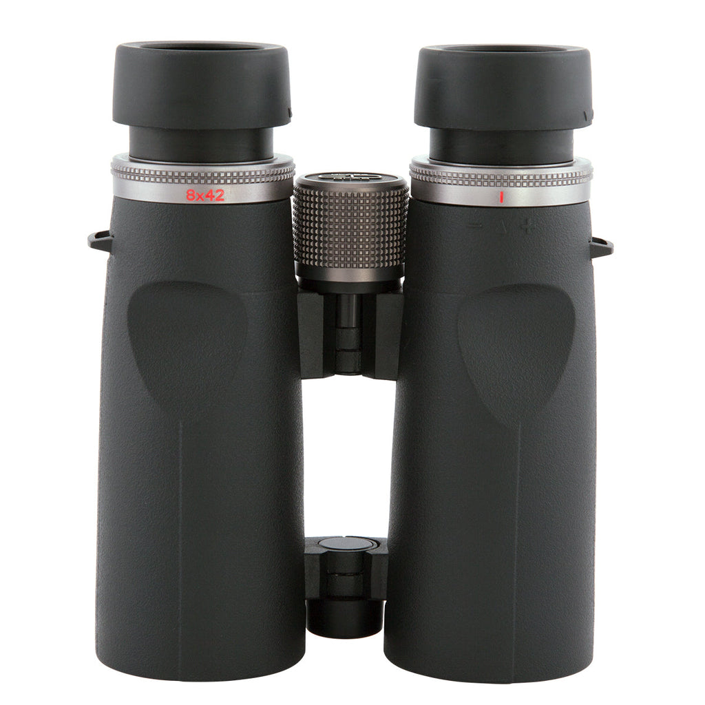 The craftsmanship extends beyond the optics, with a roof prism layout that results in a slender design that’s easy to handle. The contoured indentations on the barrels allow for optimal thumb placement, offering excellent support, while the rubber armor provides a secure grip and protection against damage. The central focusing wheel rotates smoothly and is textured for easy, subtle adjustments, while the twist-up eyecups block stray light and are particularly useful for eyeglass wearers. The diopter adjustment wheel near the right eyepiece clicks into place for perfect focus in both eyes, ensuring clarity.