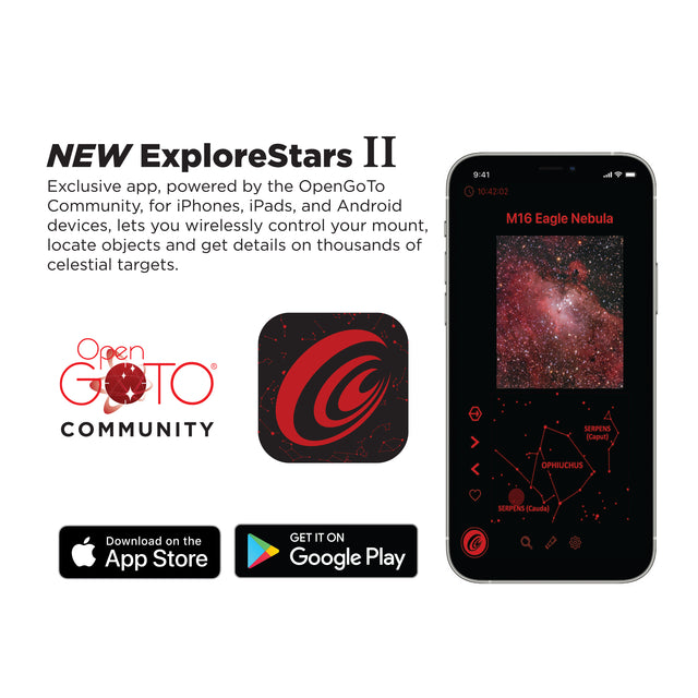 Although it is internally complex, the GOTO system can be easily operated from your own Apple, Android or Windows tablet using the ExploreStars app, which has an intuitive nature that makes it simple and quick to align your telescope, navigate the stars and learn specifics about tens of thousands of celestial objects. This dynamic app is fueled by a database that is routinely updated to ensure it remains a relevant resource.