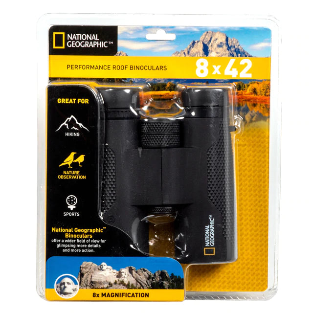 The popularity of the National Geographic 8x42 Roof Prism Binocular is due to its large aperture that produces bright images and high resolution, enough magnification for serious nature studies and spectator sports, in a comfortable to hold roof prism design. Use the large rear wheel to keep your feathered friend in focus, and observe his behavior in crystal clarity through the coated BaK-7 lenses. Extended bird-watching sessions in the wild are a breeze, thanks to the lightweight, water-resistant body and lanyard to keep the binoculars at your fingertips while you hike through the bush.
