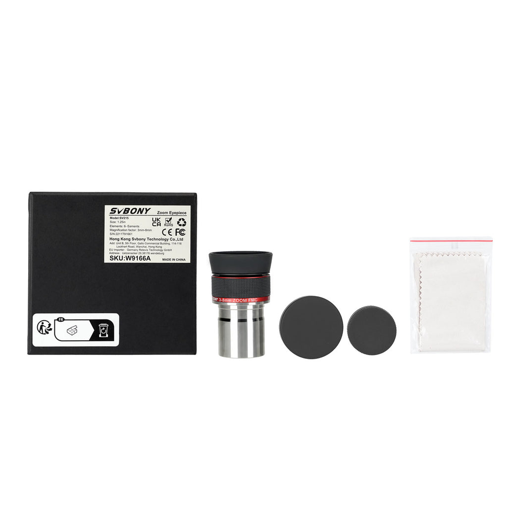 The SV215 eyepiece brings a whole range with focal lengths from 3mm to 8mm in a single high-quality eyepiece! It lets you continuously zoom with Click-stops at 8, 7, 6, 5, 4 and 3 mm.
