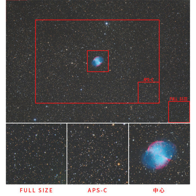 The optical system structure of 4 elements in 3 groups corrects the coma error to render sharp images up to the edge of the field of view. The extender illuminates the field of a full-frame camera (44 image circle). When used in combination with the eyepiece adapter, the 31.7 mm eyepiece can be used for visual observations.