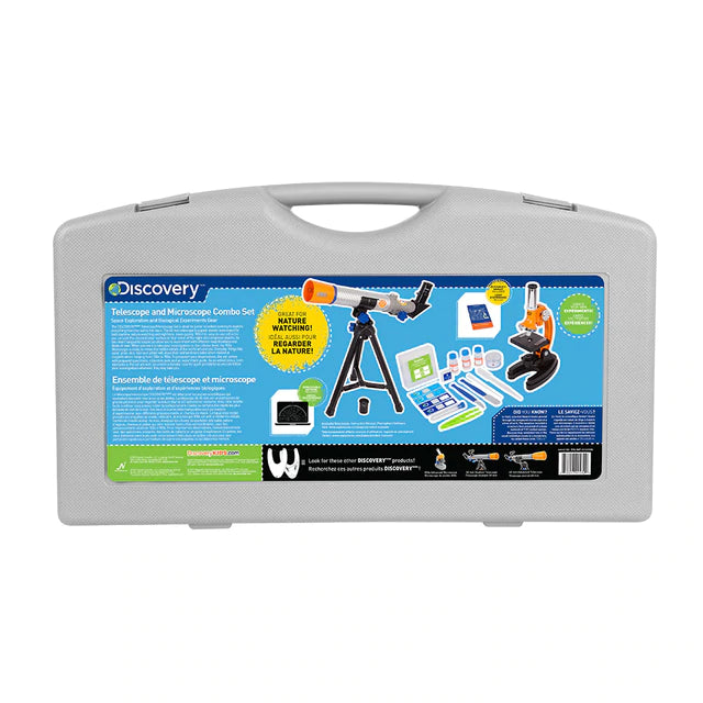 The Discovery Telescope and Microscope Combo Set 44-41101 is ideal for junior scientists looking to explore everything from the soil to the stars. The 40 mm telescope is a great starter instrument for both daytime nature watching and nighttime moon gazing. With this easy-to-use refractor, you can visit the chiseled lunar surface or tour some of the night sky's brightest objects. Its two interchangeable eyepieces allow you to experiment with different magnifications and fields of view. When you want to take your investigations to the cellular level, the 900x Microscope is ready to reveal the hidden details of the world around you. Everyday things like sand, onion skin, hair and pollen will show their extraordinary sides when viewed at magnifications ranging from 100x to 900x. To jumpstart your observations, the set comes with prepared specimens, collection tools and an experiment guide. As an added bonus, both elements in the set are well secured in a durable case for quick portability so you can follow your investigations wherever they may take you.