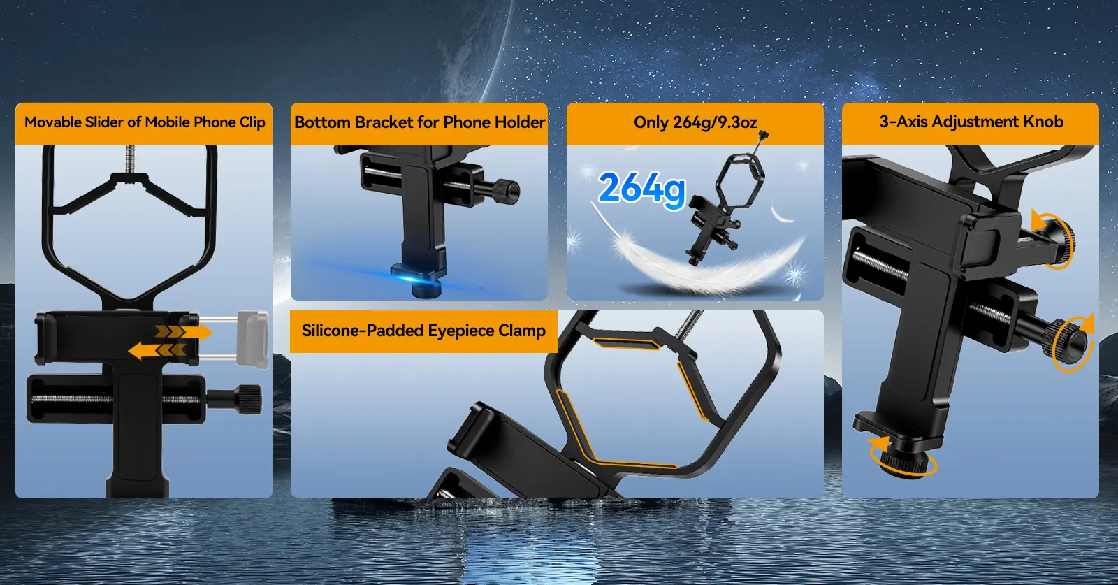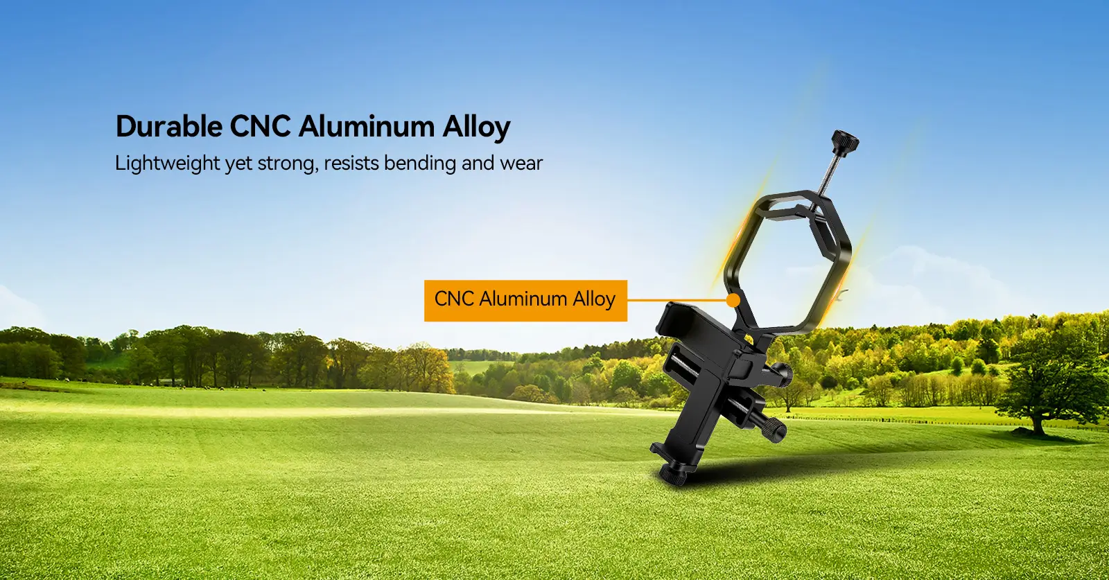• Aluminum alloy material; the telescope phone adapter for robust and durable, doesn't bend, tilt or warp, holds your cellphone tight;