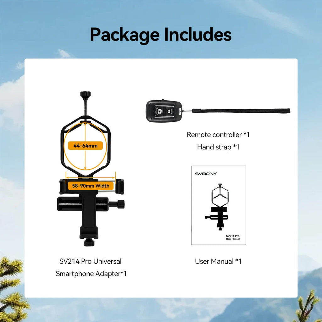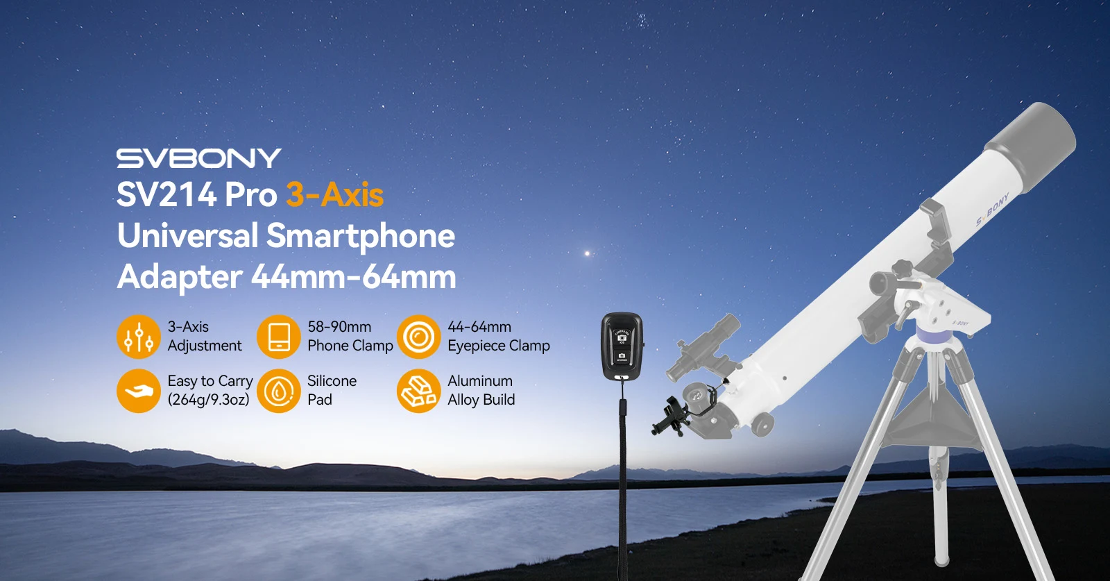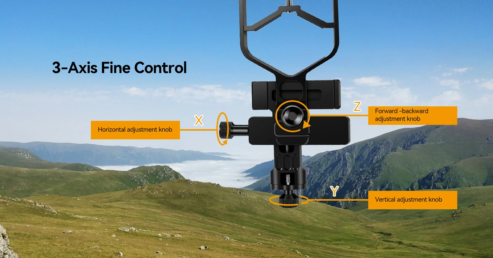 • 3-Axis adjustment; the SV214 Pro 3-axis universal smartphone adapter features 3-direction precise adjustment; up and down; left and right; forward and backward; to center your phone camera with eyepieces with accuracy;