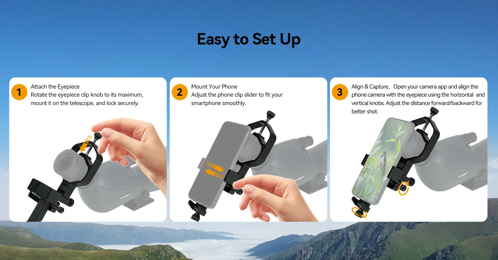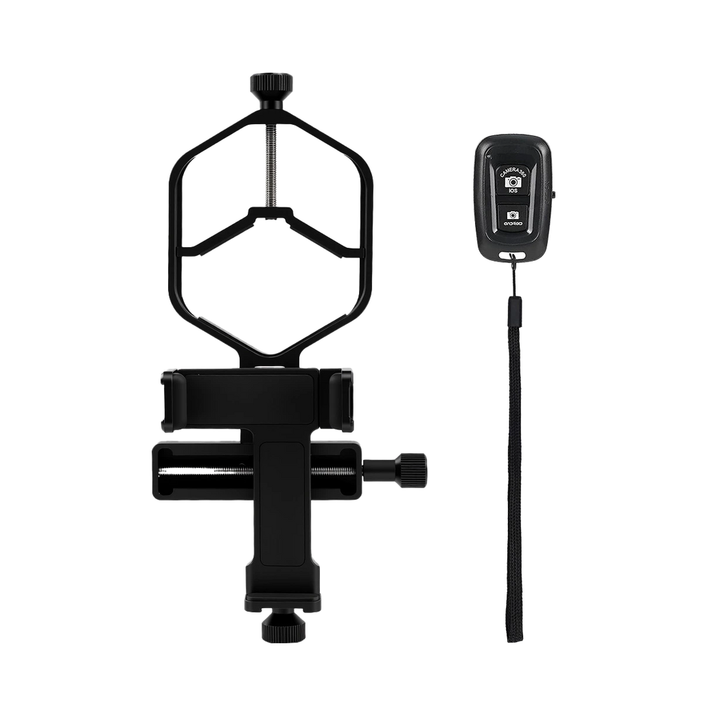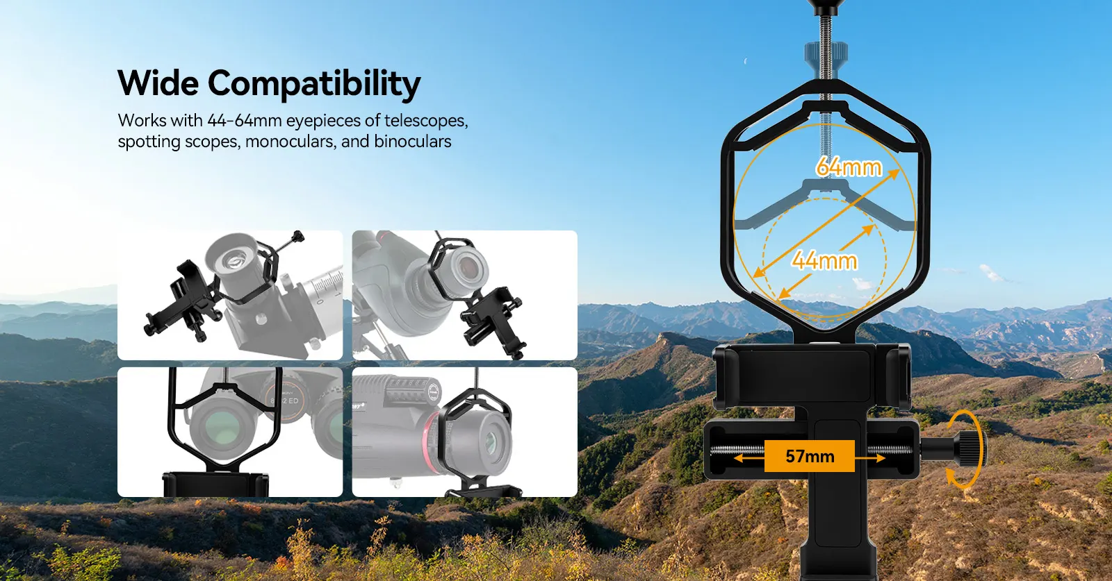 The telescope phone adapter fits iPhone/Android smartphones of almost any brand/model (width  55mm-105mm)