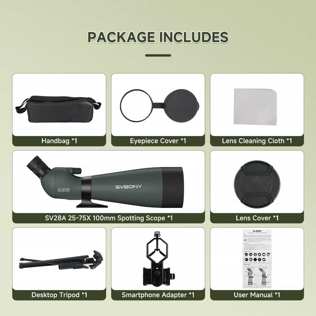 SVBONY SV28A spotting scope is equipped with a large-aperture objective lens of 100mm and a 4-piece & 3-group eyepiece, utilizing FMC coating technology to ensure bright and clear imaging. It comes with an all-in-one accessory package that allows for flexible combinations and usage. Whether in shooting and target observing scenarios or during observation activities, the spotting scope captures every moment with clarity.